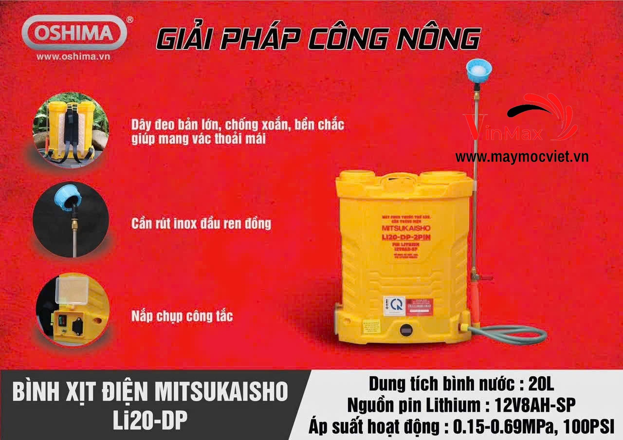 Bình xịt điện Mitsukaisho Li20 là thiết bị phun thuốc, phân bón, khử trùng đa năng dành cho nông nghiệp, vườn cây, trang trại hoặc ứng dụng trong công nghiệp. Với dung tích lớn 20 L cùng nguồn điện (ắc quy) tích hợp, sản phẩm giúp tiết kiệm thời gian và nhân lực so với phun tay truyền thống.
