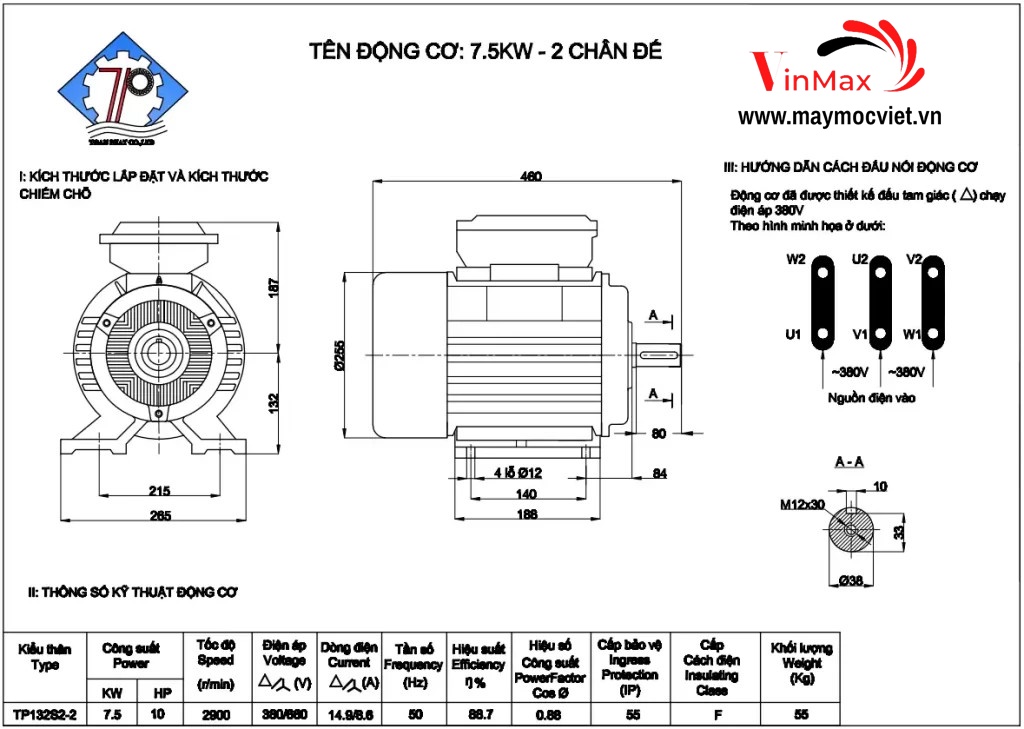 Động cơ 3 pha với mức công suất 7.5 kw tương đương 10 hp đáp ứng được hầu hết các ứng dụng công việc cần đến nó. Động cơ thế hệ mới tiết kiệm điện năng, chất lượng cao và phù hợp với nhiều điều kiện môi trường làm việc khác nhau.