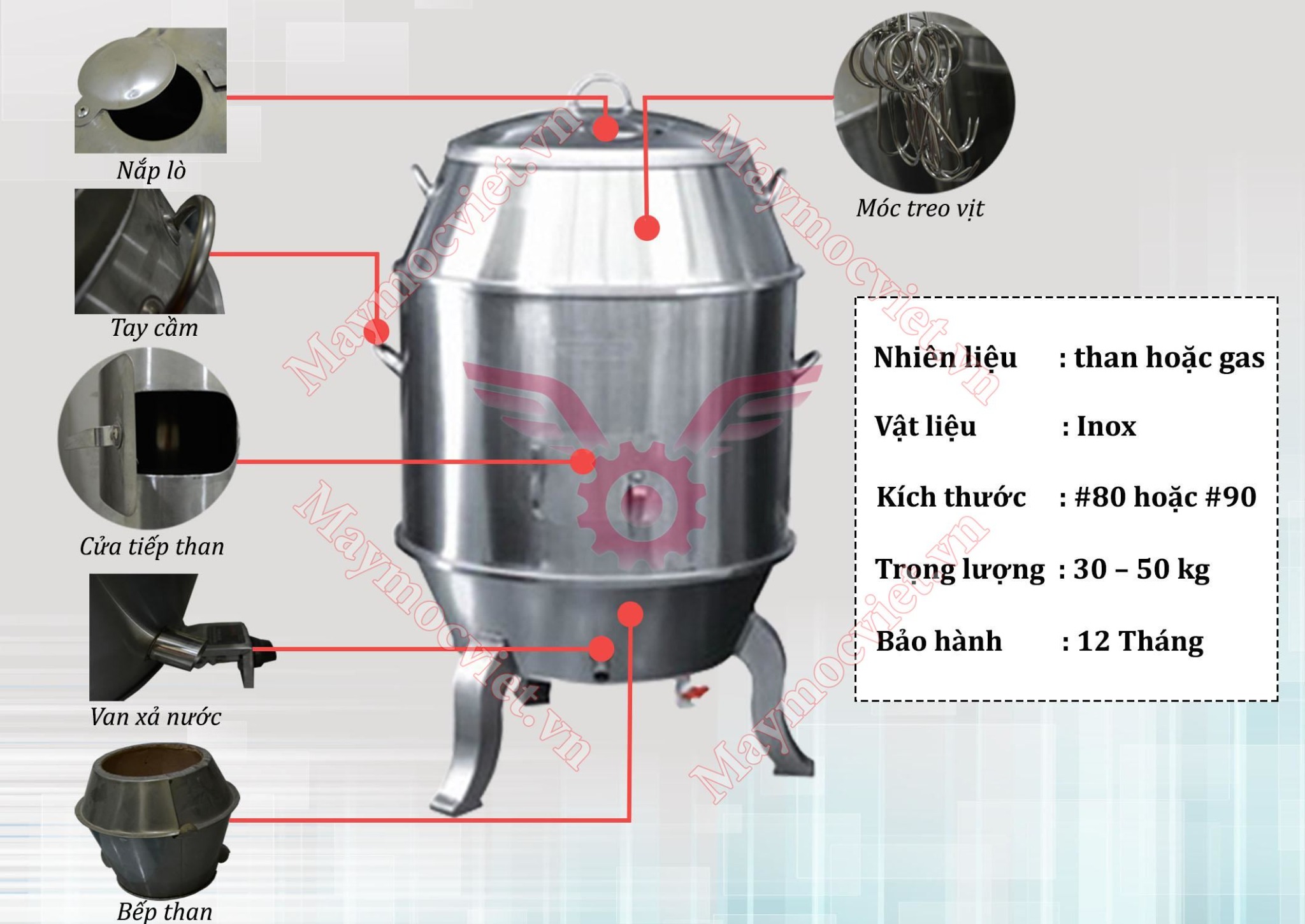 Thân lò có cửa với chốt an toàn kín giúp quay vịt chín và đều hơn. Lò còn có thể dùng được bếp gas và bếp than trên cùng một lò mà không hề ảnh hưởng gì đến mùi vị của vịt gà quay.