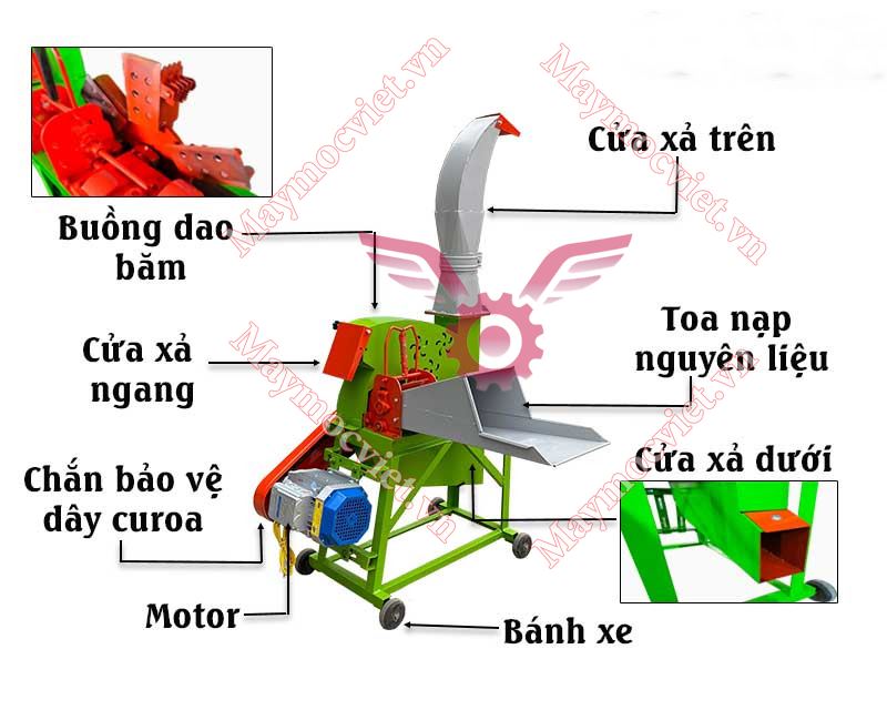 Không chỉ có 1 của xả thành phẩm như các dòng máy băm cỏ thông thường, với phiên bản máy băm cỏ cổ hạc VMH3000 loại mới, đội ngũ kỹ thuật của công ty Vinmax đã nghiên cứu và cho ra đời 1 loại máy băm cỏ chuyên dụng với 3 cửa xả thành phẩm phục vụ tối đa nhu cầu cho bà con chăn như phun lên thùng xe, phun vào máng ăn, phun ủ cỏ,… một cách tiện lợi và nhanh chóng. Chức năng chính của băm cỏ voi và thân cây ngô, cà gai leo,…năng suất cao mà không mất nhiều thời gian và công sức.