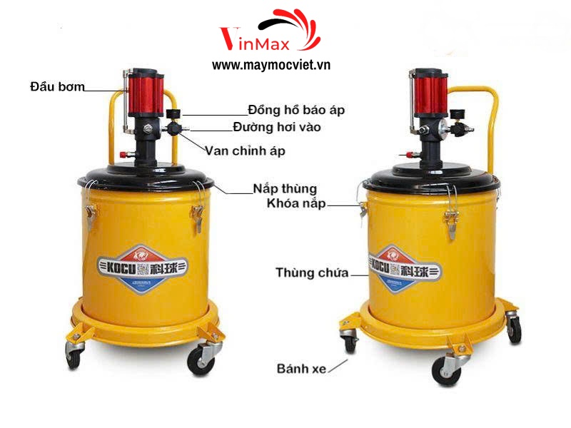 Sử dụng khí nén giúp lực bơm ổn định, mỡ ra đều và nhanh, phù hợp cho khối lượng công việc lớn mỗi ngày.