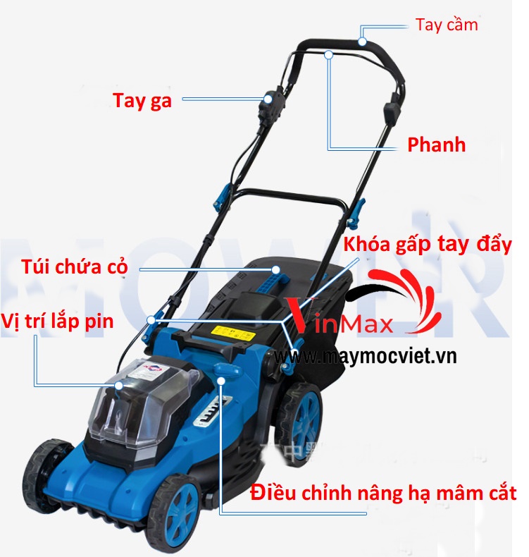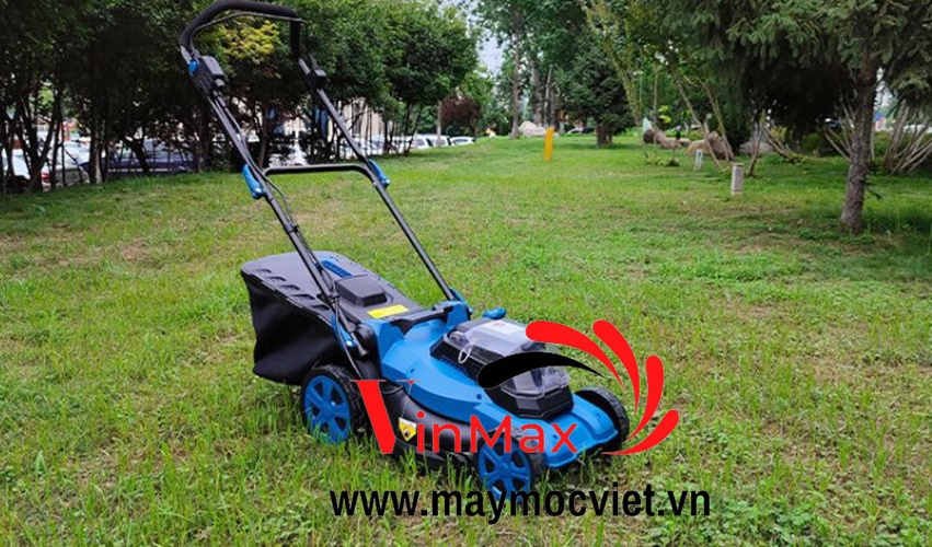 Máy sử dụng 2 pin 18V, dung lượng 5Ah có khả năng sử dụng ở mọi vị trí và thời gian mà không phụ thuộc nguồn điện. Máy có thể cắt một khoảng sân diện tích 475m2 - 950m2 tùy vào dung lượng pin.