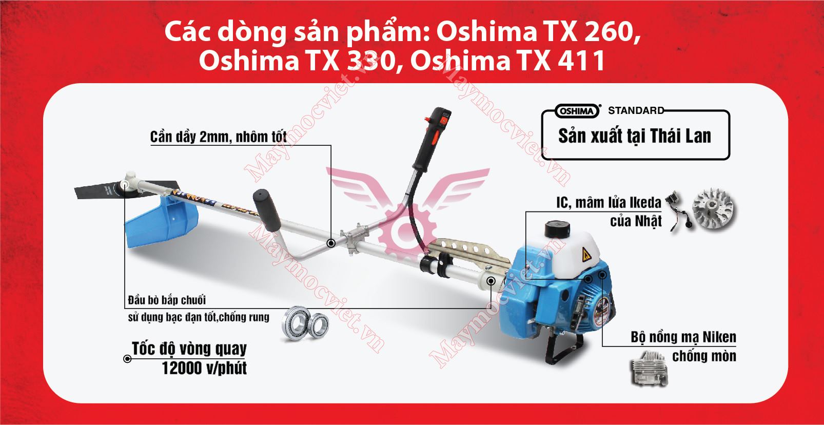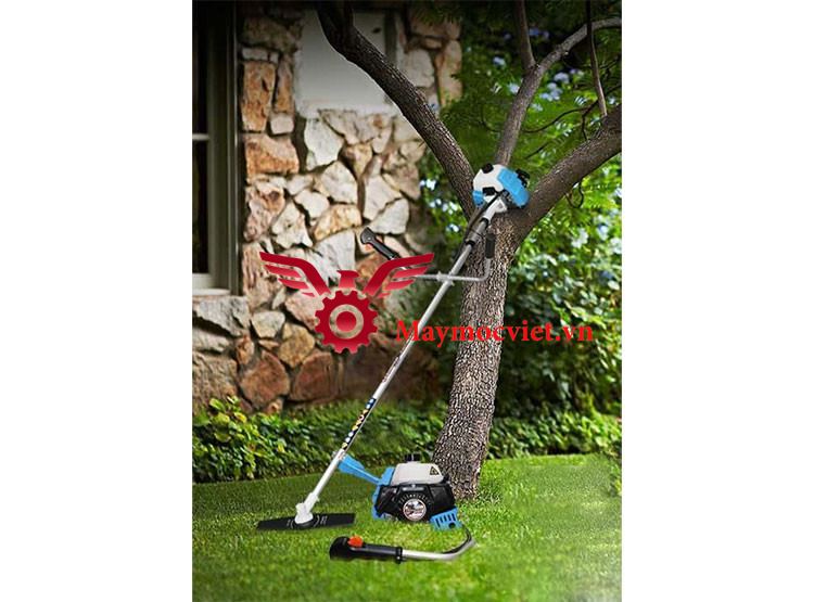 Đường kính xilanh của máy lớn đến 40mm cho lực đẩy mạnh. Tốc độ quqay của máy là 12.000 vòng/phút cho khả năng cắt cỏ nhanh và đều hơn. Đầu bò, bắp chuối, chén lớn được sơn lớp sơn bóng sáng. Dây đeo của máy là loại dây lớn chắc chắn và vó khóa nhanh. Tay dên và bạc đạn được sản xuất theo công nghệ Nhật Bản.