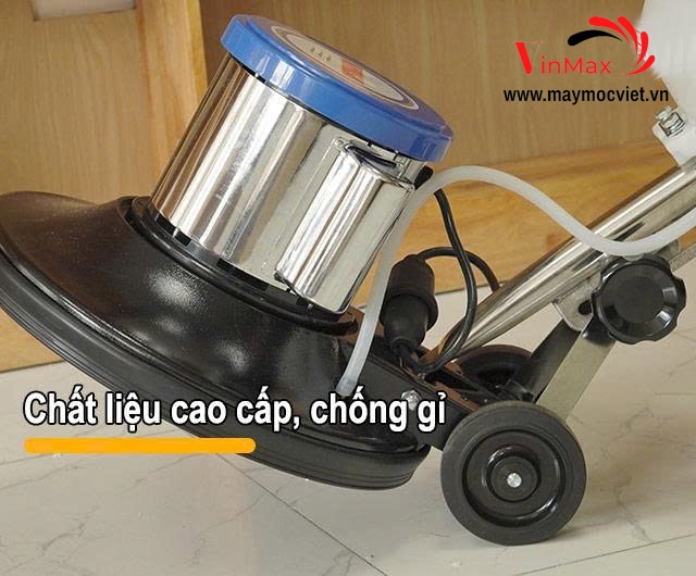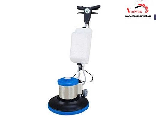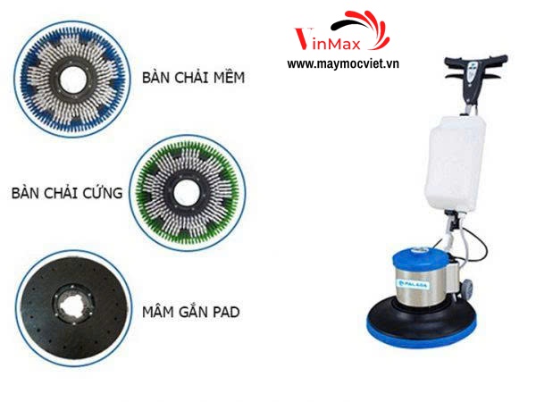 Máy vận hành bằng điện 220V, đi kèm bình chứa dung dịch tẩy rửa, bàn chải và mâm gai giúp làm sạch nhanh chóng mà vẫn đảm bảo an toàn cho mặt sàn.
