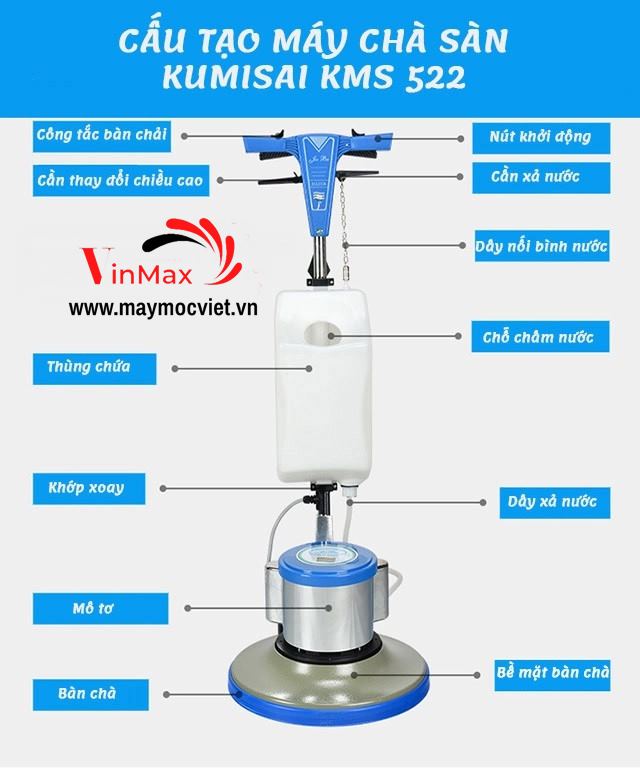 Máy chà sàn Kumisai KMS 522 là thiết bị dọn vệ sinh cao cấp có khả năng làm sạch đánh bóng mọi mặt sàn và giặt thảm tiện lợi. Thiết bị được ứng dụng nhiều trong đời sống hàng ngày.