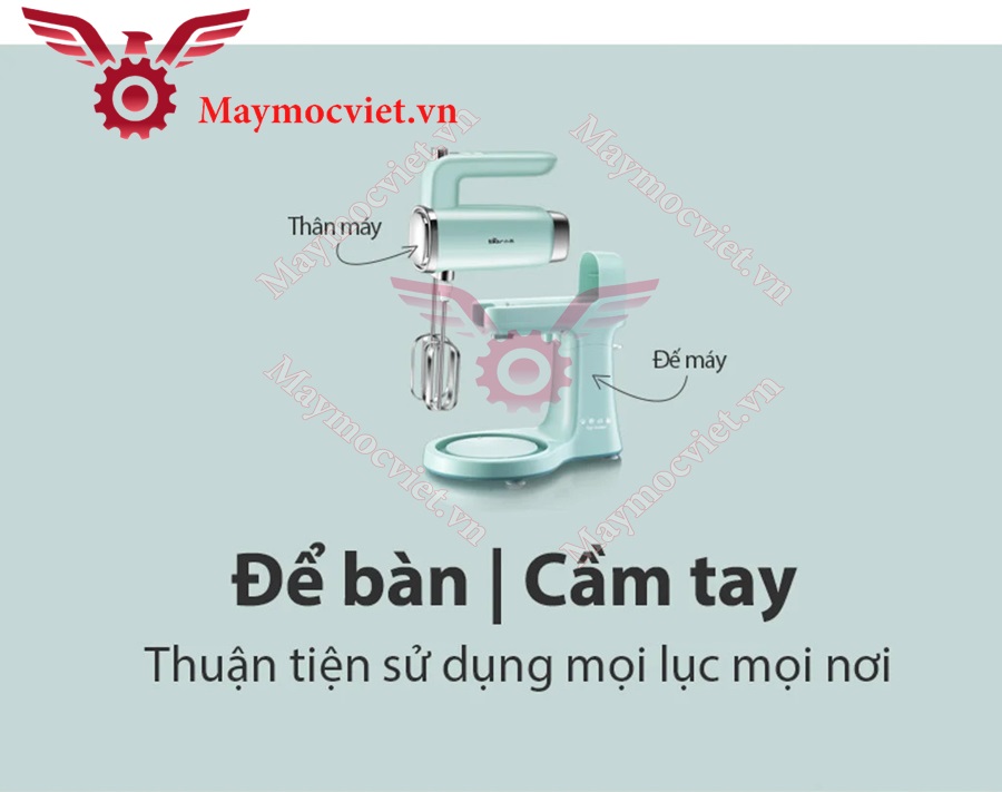Máy đánh trứng được thiết kế với 2 kiểu sử dụng: cầm tay và để bàn tiện dụng. Bạn có thể sử dụng kiểu cầm tay khi chế biến ít nguyên liệu, còn đối với kiểu để bàn có giá đỡ thì phù hợp khi cần chế biến nhiều nguyên liệu hoặc dùng để nhào bột sẽ giúp bạn đỡ mỏi tay hơn khi không phải cầm lâu.