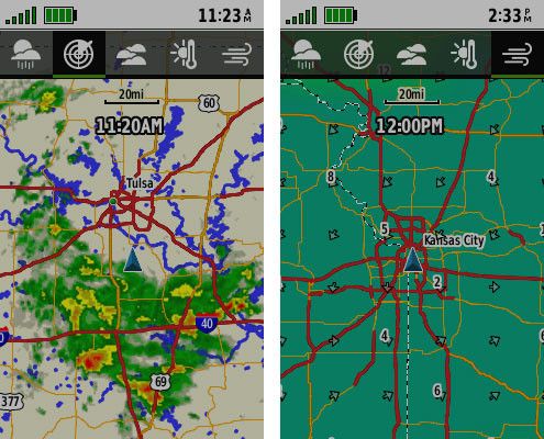 Bạn sẽ luôn được thông báo về các điều kiện thời tiết khi bạn ghép nối thiết bị sê-ri GPSMAP 66 của mình qua Bluetooth® với điện thoại thông minh tương thích . Nhận cập nhật thời tiết cho thông tin dự báo thời gian thực, bao gồm các bản đồ dự báo về nhiệt độ, gió, lượng mưa và mây. Nó cũng cung cấp radar thời tiết trực tiếp để bạn biết về thời tiết khắc nghiệt có thể ảnh hưởng đến cuộc phiêu lưu ngoài trời của bạn.