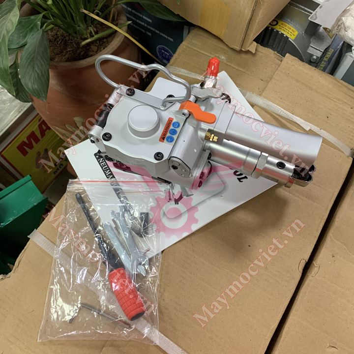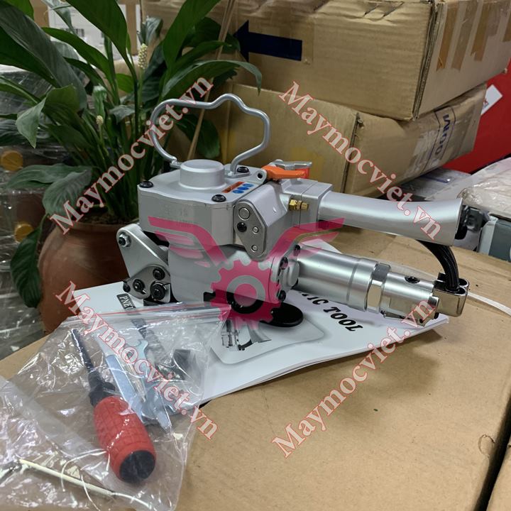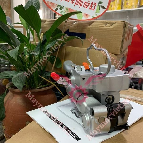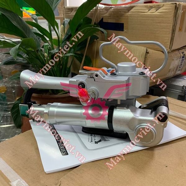 Máy đóng đai nhựa dùng khí nén 3 trong 1: Siết dây, hàn nhiệt nối hai đầu, cắt dây đai dễ dàng.