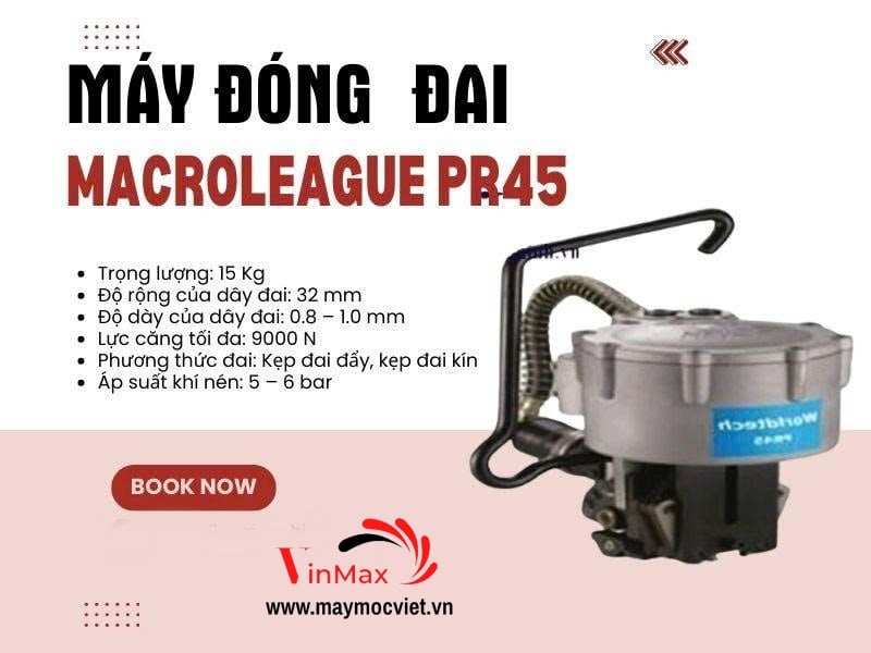 Máy đóng đai sắt thép khí nén Macroleague PR45 là thiết bị chuyên dụng trong việc đóng gói, siết chặt và cố định kiện hàng bằng dây đai thép. Với thiết kế hiện đại, vận hành bằng khí nén, máy mang lại lực siết mạnh mẽ, giúp công việc đóng đai trở nên nhanh chóng – an toàn – tiết kiệm chi phí.