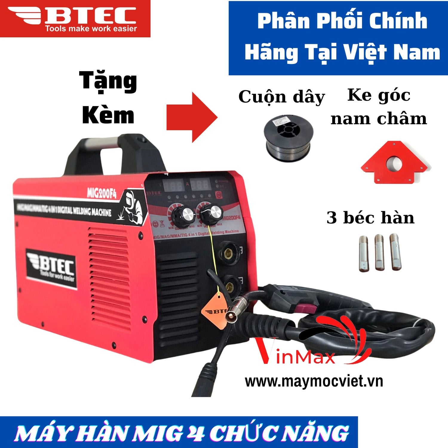 Btec MIG200F4 là máy hàn đa năng, được tích hợp các chức năng sau: Hàn Mig có khí, hàn Tig, hàn Mig không dùng khí và hàn que. Nhờ vậy mà máy hàn có thể hàn được nhiều chất liệu khác nhau.