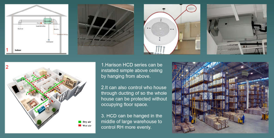 Máy hút ẩm treo trần được thiết kế chuyên dụng cho lắp đặt trên trần nhà, trên cao tương tự như dạng điều hòa trung tâm. Vừa đảm bảo khử ẩm tốt, lưu thông không khí dễ dàng. Với khả năng hút ẩm với công suất 90 l/ngày, hoàn toàn đáp ứng tốt cho nhiều phòng kho, xưởng,....