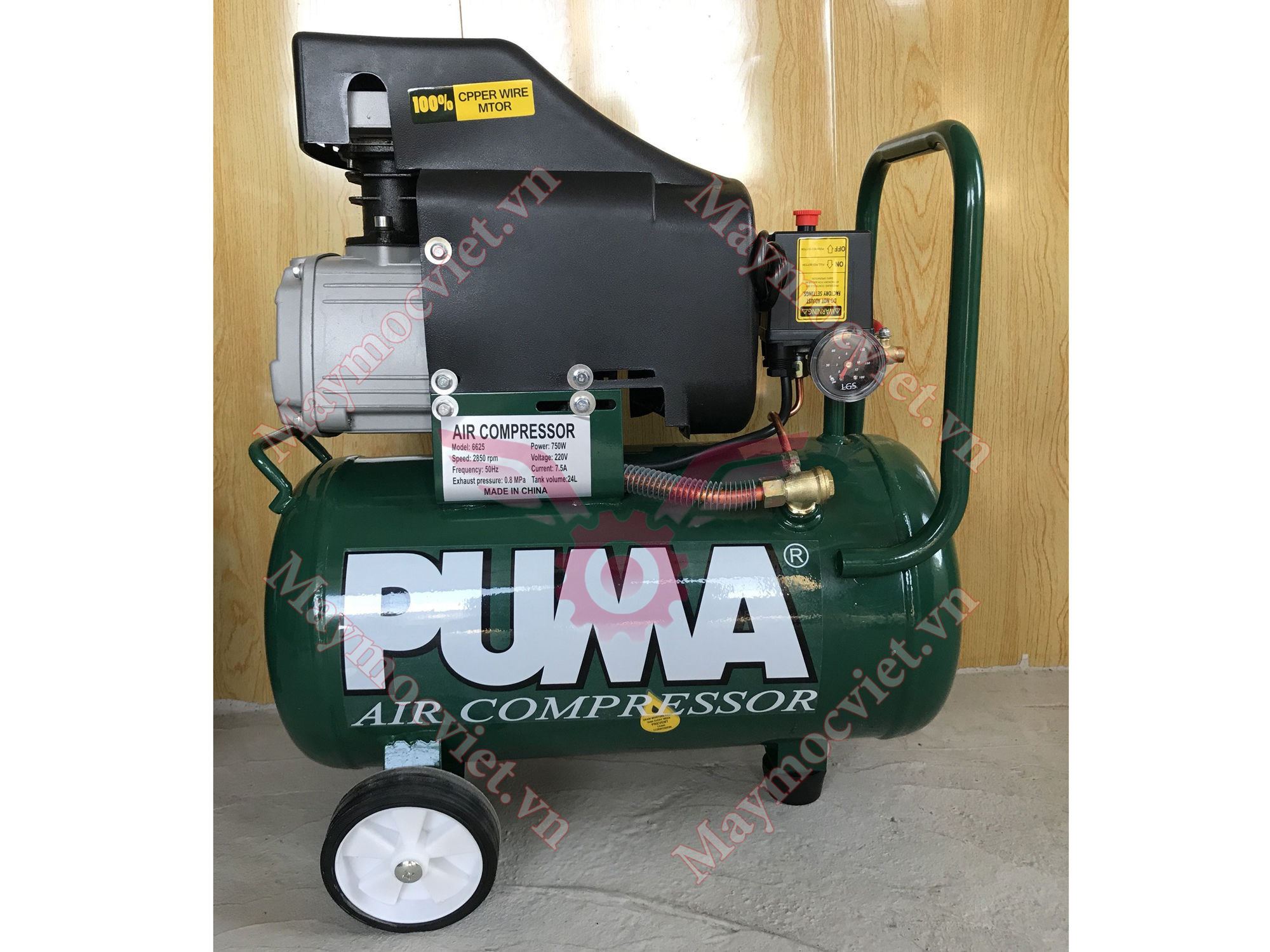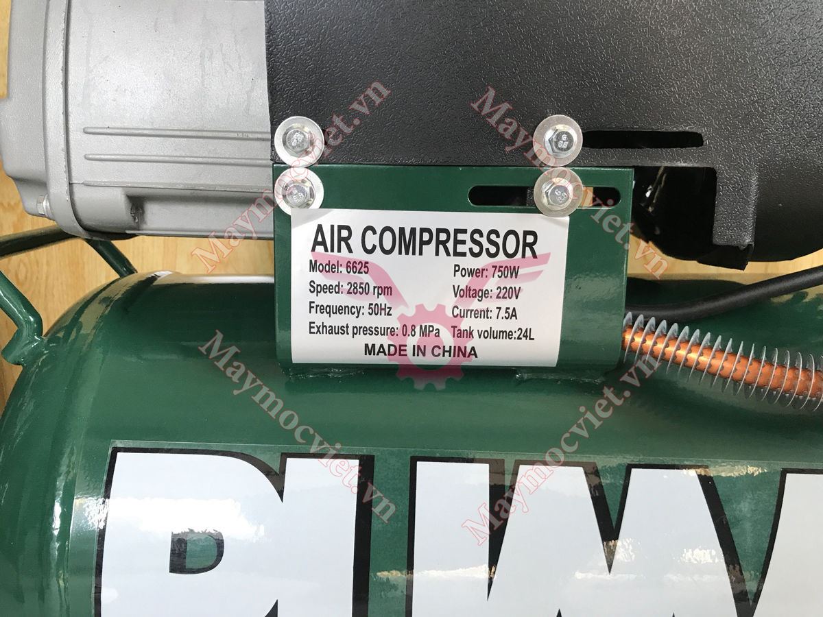 Bình chứa khí có dung tích 24 lít, có trang bị 2 bánh xe di chuyển. Dưới đầu máy nén có chân đế giúp giữ thăng bằng và cố định máy chắc chắn trên bề mặt. Động cơ được quấn lõi dây đồng chạy bền bỉ, êm hơn, tuổi thọ sử dụng cao.