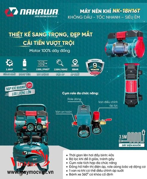 Máy nén khí không dầu Nakawa NK-18H16T – 16 lít là dòng máy nén khí mini cao cấp, nổi bật với khả năng nén nhanh, khí sạch 100% không lẫn dầu, vận hành êm ái, độ bền cao. Sản phẩm đặc biệt phù hợp cho các công việc yêu cầu khí nén sạch như: nha khoa, y tế, phun sơn mini, sửa chữa điện tử, tiệm nail, spa, gia đình và xưởng nhỏ.