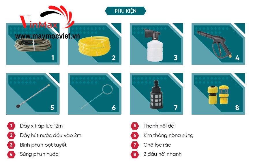 Phụ kiện bao gồm: chõ lọc rác, dây hút nước đầu vào 2m, dây áp lực 12m, súng phun nước, bình phun bọt tuyết, thanh nối dài. Với bộ phụ kiện đầy đủ bạn chỉ cần lắp đặt là có thể sử dụng luôn mà không cần phải mua thêm bất kỳ bộ phận nào khác.