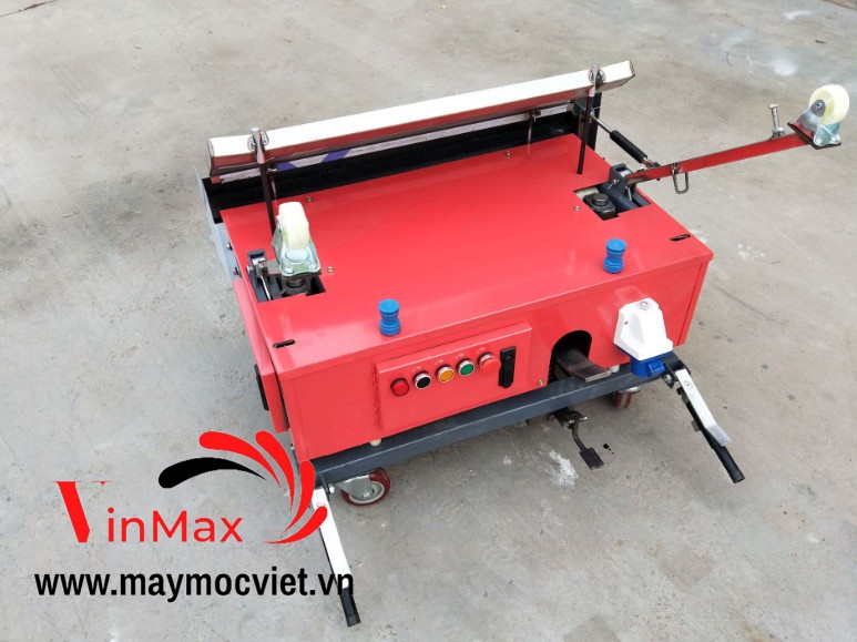 Đưa bộ phận thực hiện trát xuống vị trí thấp nhất, đổ vữa vào bồn và mở máy để hai động cơ nâng hạ và rung cùng làm việc.