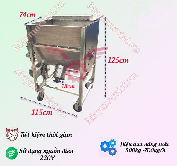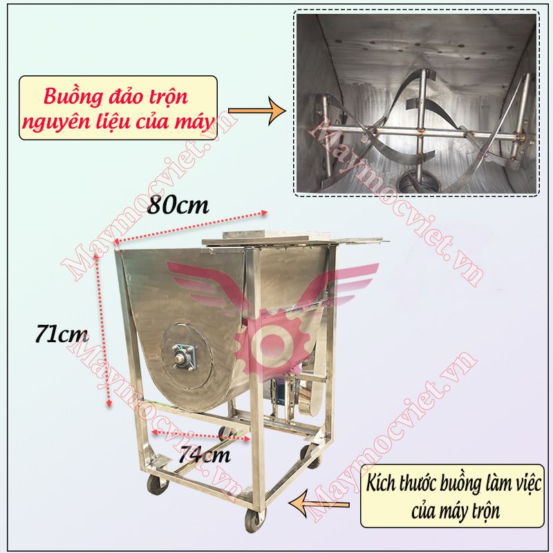 Buồng làm việc đảo trộn của máy có thể chứa đựng được 50kg nguyên liệu trong một mẻ trộn. Kích thước buồng làm việc của máy (CD 80cm*CR 74cm*CC 71cm). Hệ thống đảo trộn cánh xoắn trong buồng làm việc có thể nhiệm đảo trộn đều mọi loại nguyên liệu.