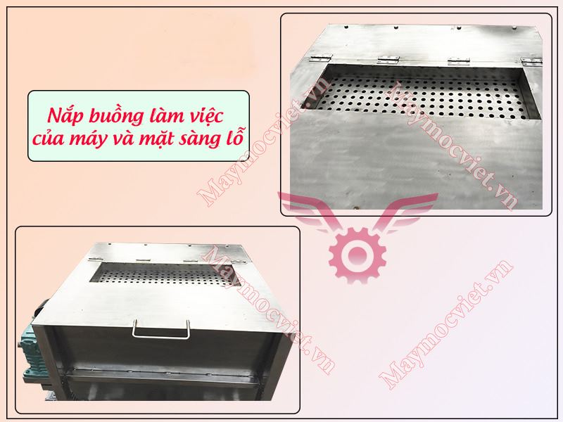 Nắp buồng làm việc được thiết kế thêm mặt sàng lỗ hỗ trợ cho người dùng tiếp thêm nước(độ ẩm) khi máy đang hoạt động đảo trộn đều nguyên liệu.