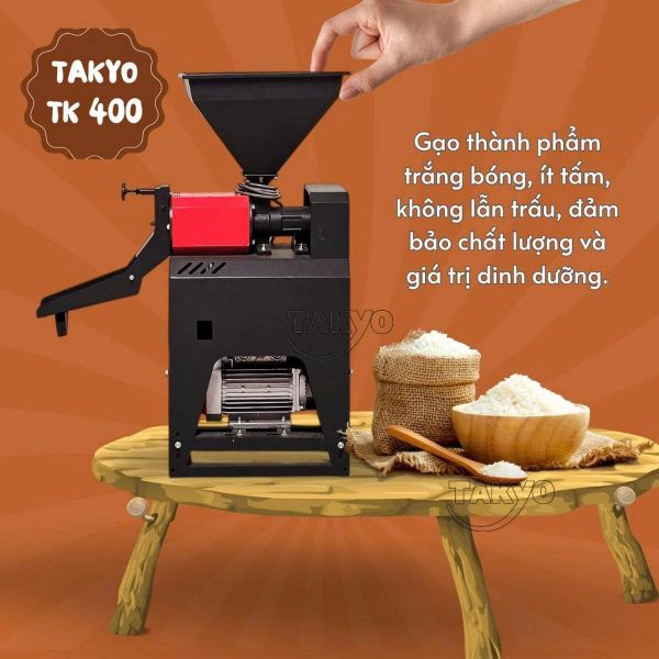 Máy xát gạo Takyo TK 400 là dòng máy xát gạo gia đình hiện đại với thiết kế nhỏ gọn và vận hành đơn giản. Sở hữu động cơ mạnh mẽ 3,5 kW, khả năng xát sạch nhanh với công suất khoảng 200–400 kg gạo thành phẩm mỗi giờ, giúp tiết kiệm thời gian và điện năng