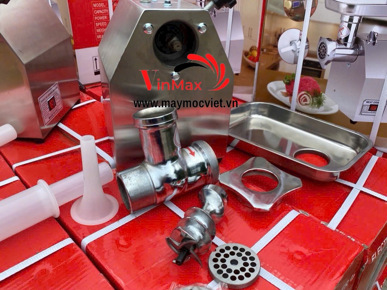 | Phụ kiện | 2 sàng, 2 dao, 1 ống dồn xúc xích, 1 cây đùn thịt |