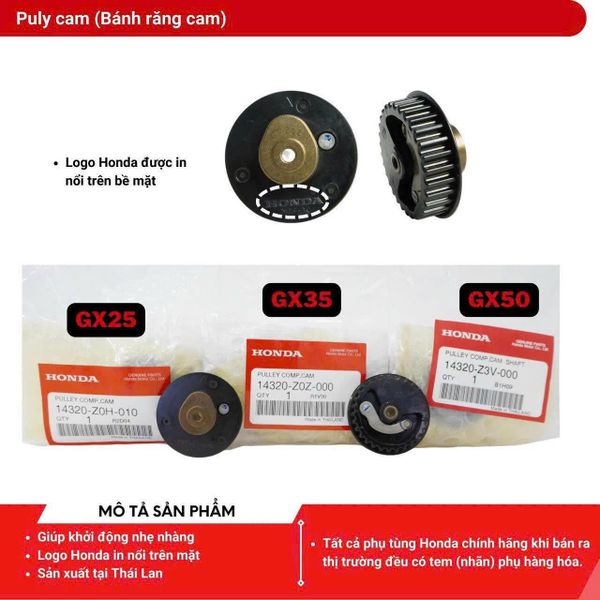 Puly cam Honda GX25, GX35 là bộ phận quan trọng trong hệ thống phân phối khí của động cơ xăng 4 thì Honda. Puly cam có nhiệm vụ truyền chuyển động từ trục khuỷu đến trục cam, đảm bảo van nạp – van xả mở đúng thời điểm, giúp động cơ vận hành ổn định, tiết kiệm nhiên liệu và đạt công suất tối ưu.