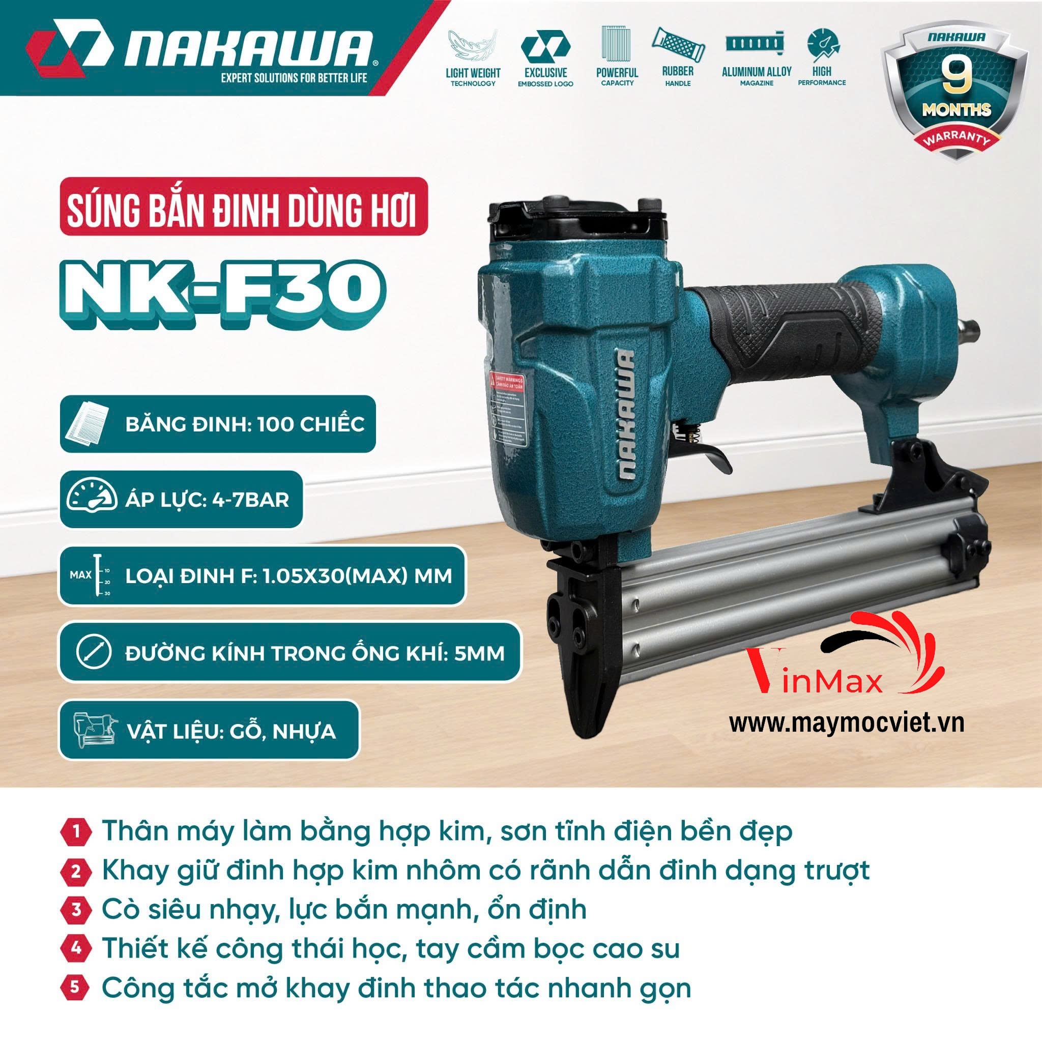 Súng bắn đinh dùng hơi NAKAWA NK-F30 là thiết bị khí nén chất lượng cao, được thiết kế để bắn đinh nhanh chóng, chính xác vào gỗ, ván MDF, pallet, khung thép nhẹ… Từ công việc lắp ráp nội thất, xây dựng nhẹ đến sửa chữa, NK-F30 luôn là bạn đồng hành đáng tin cậy của thợ mộc và kỹ thuật.