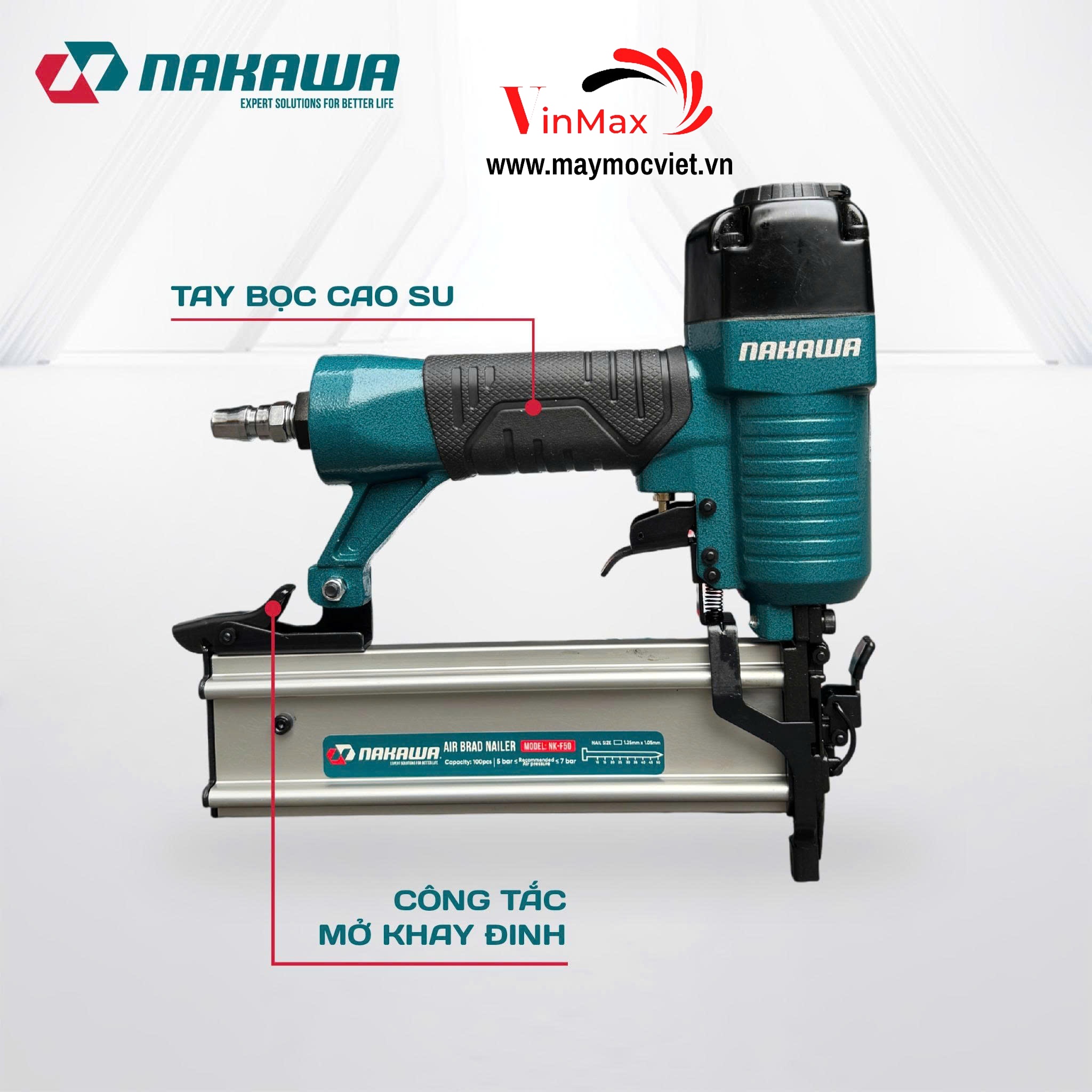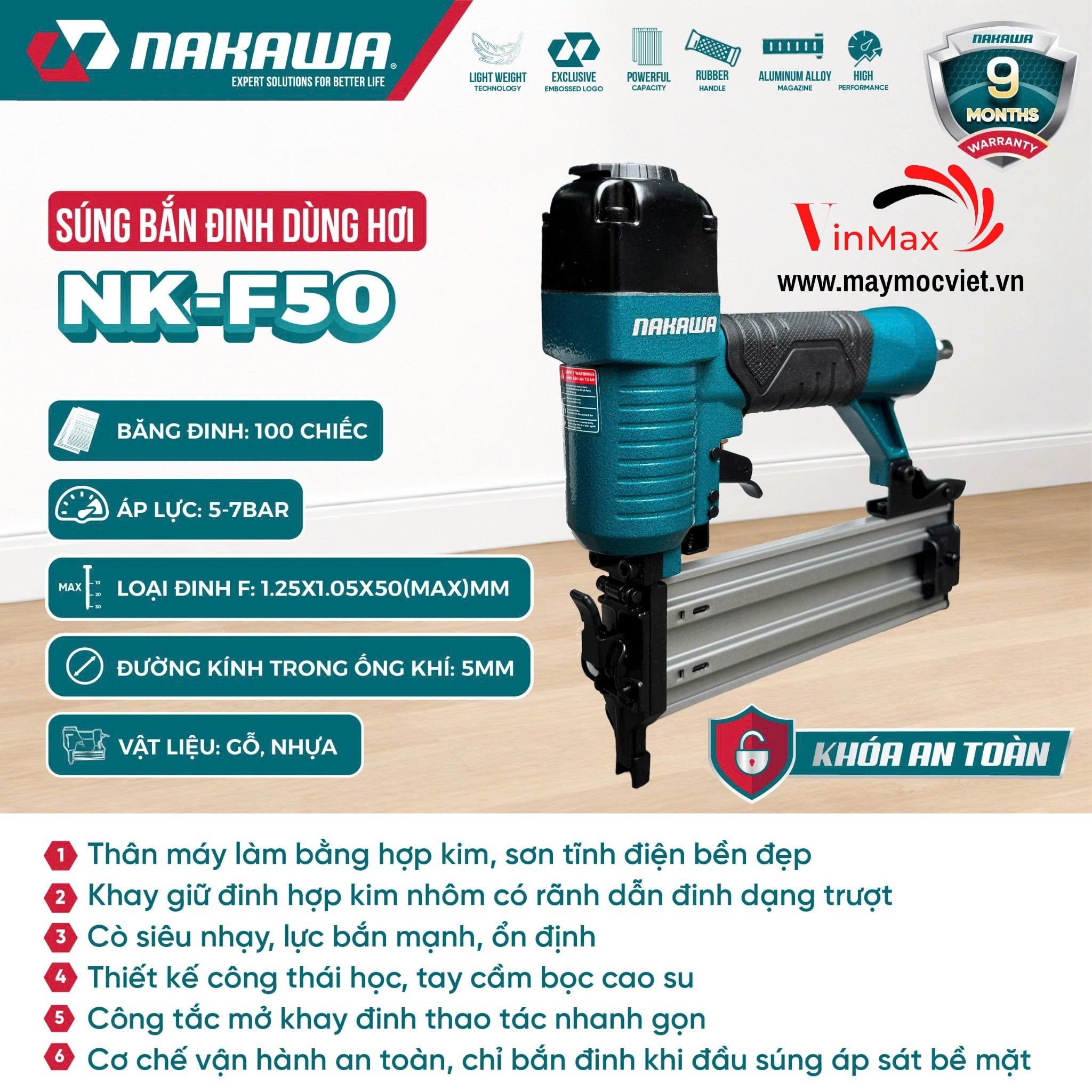 Súng bắn đinh dùng hơi NAKAWA NK-F50 là thiết bị khí nén mạnh mẽ, được thiết kế tối ưu để bắn đinh tốc độ cao, chính xác và liên tục. Với hiệu suất vượt trội, NK-F50 là công cụ không thể thiếu trong các công việc thi công nội thất, xây dựng nhẹ, lắp ghép pallet gỗ, gỗ ván công nghiệp và nhiều ứng dụng khác.
