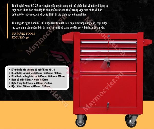 Tủ đồ nghề Kocu KC-36 có 4 ngăn giúp người dùng có thể phân loại và cất giữ dụng cụ một cách khoa học nên đây là sản phẩm rất cần thiết trong việc sửa chữa và bảo dưỡng ô tô, máy móc, cơ khí, các thiết bị gia đình hay công nghiệp.