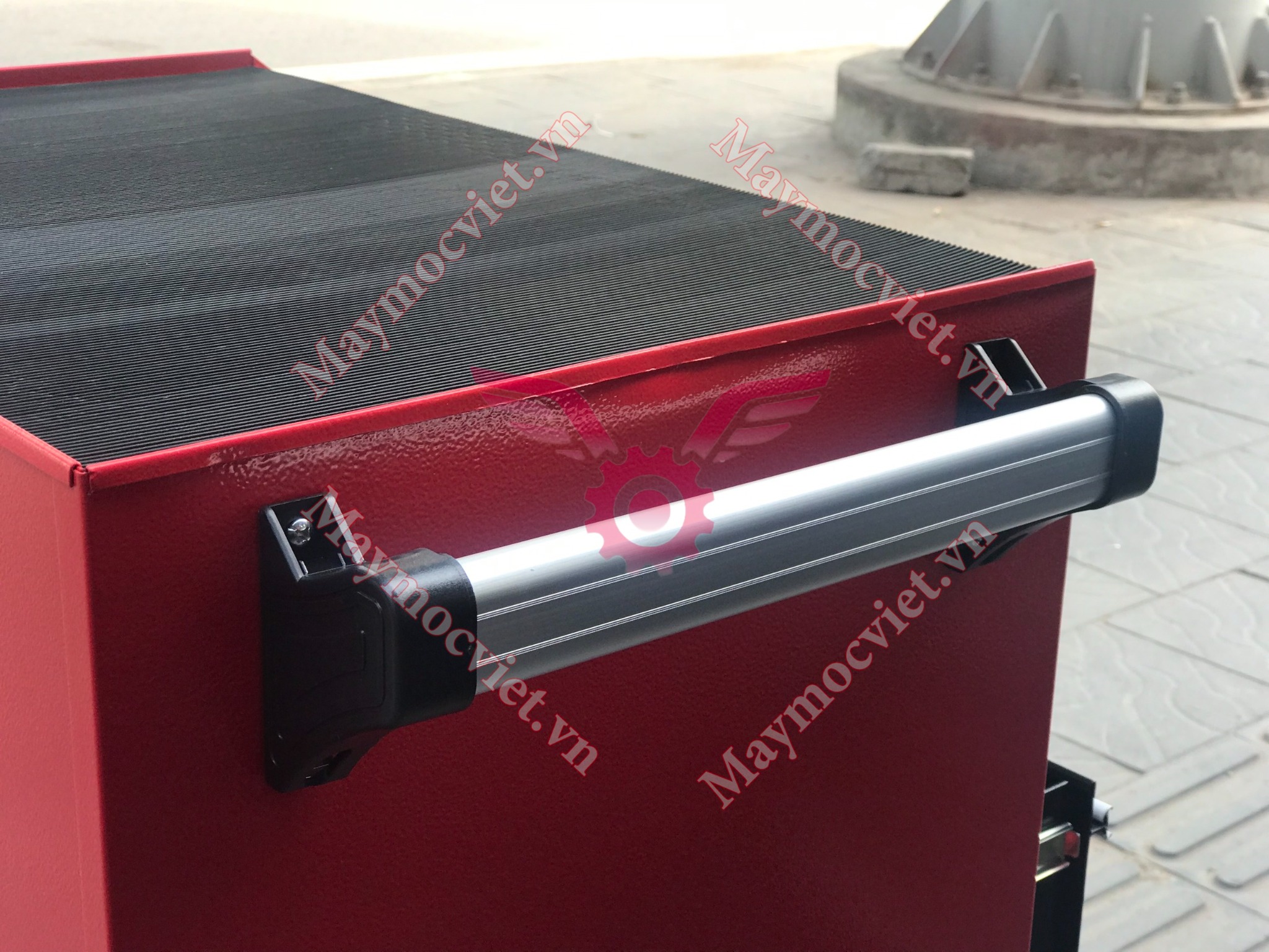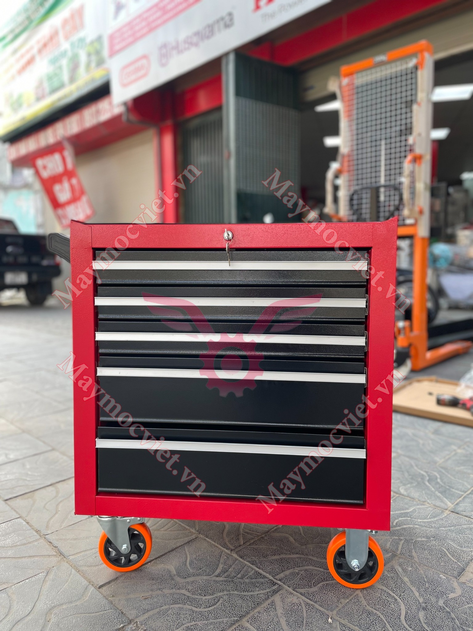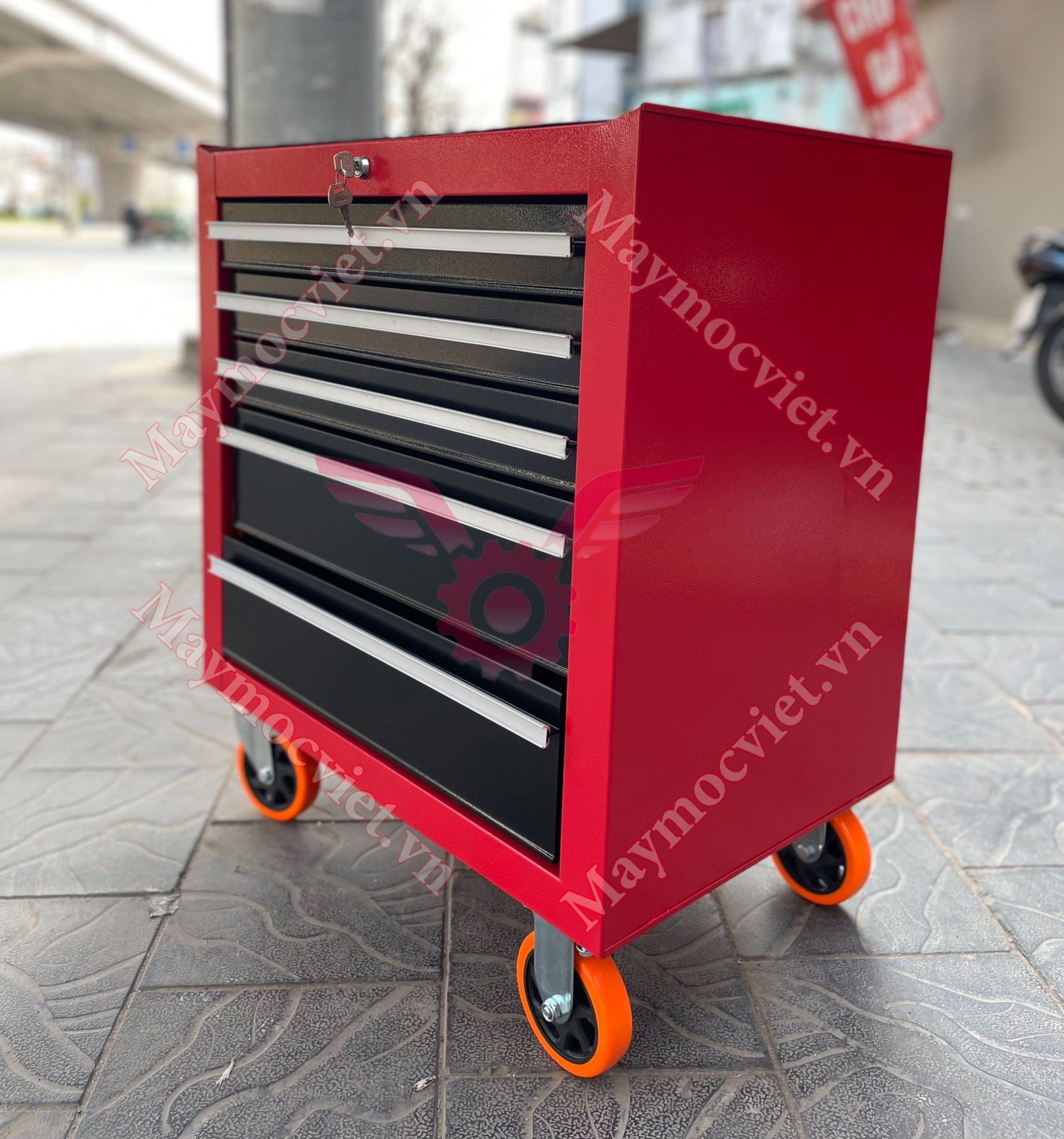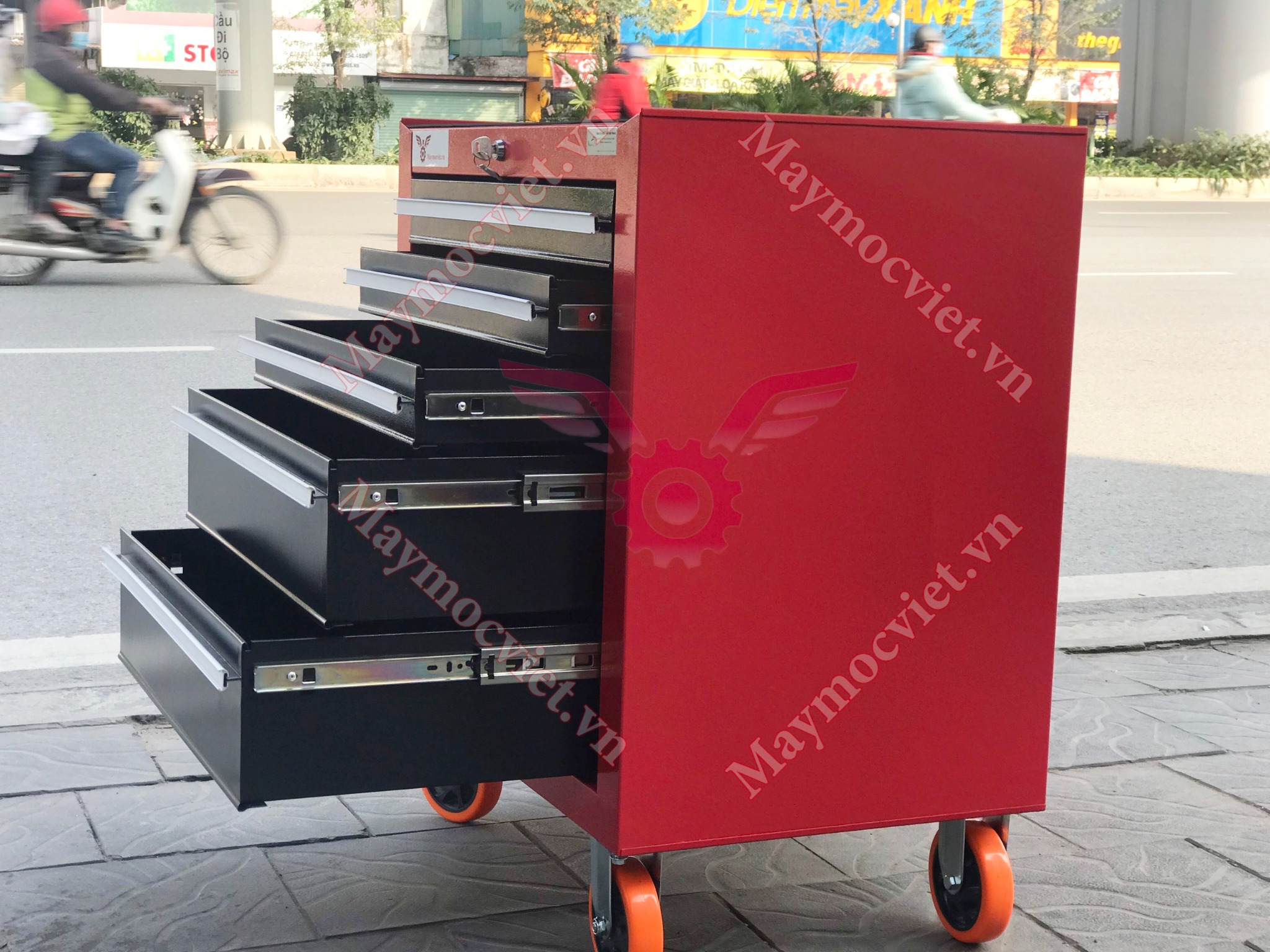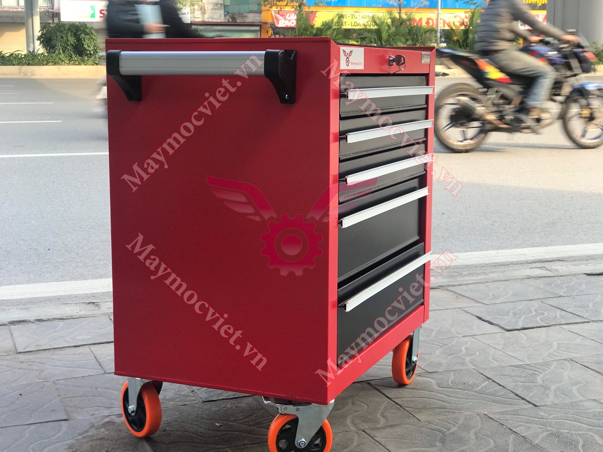 Thiết kế có tay cầm giúp việc đẩy, với bánh xe xoay 3600 giúp việc di chuyển tủ đựng dụng cụ đến nơi cần sữa chữa và lắp ráp dễ dàng hơn, phanh cố định bánh khi cần thiết.